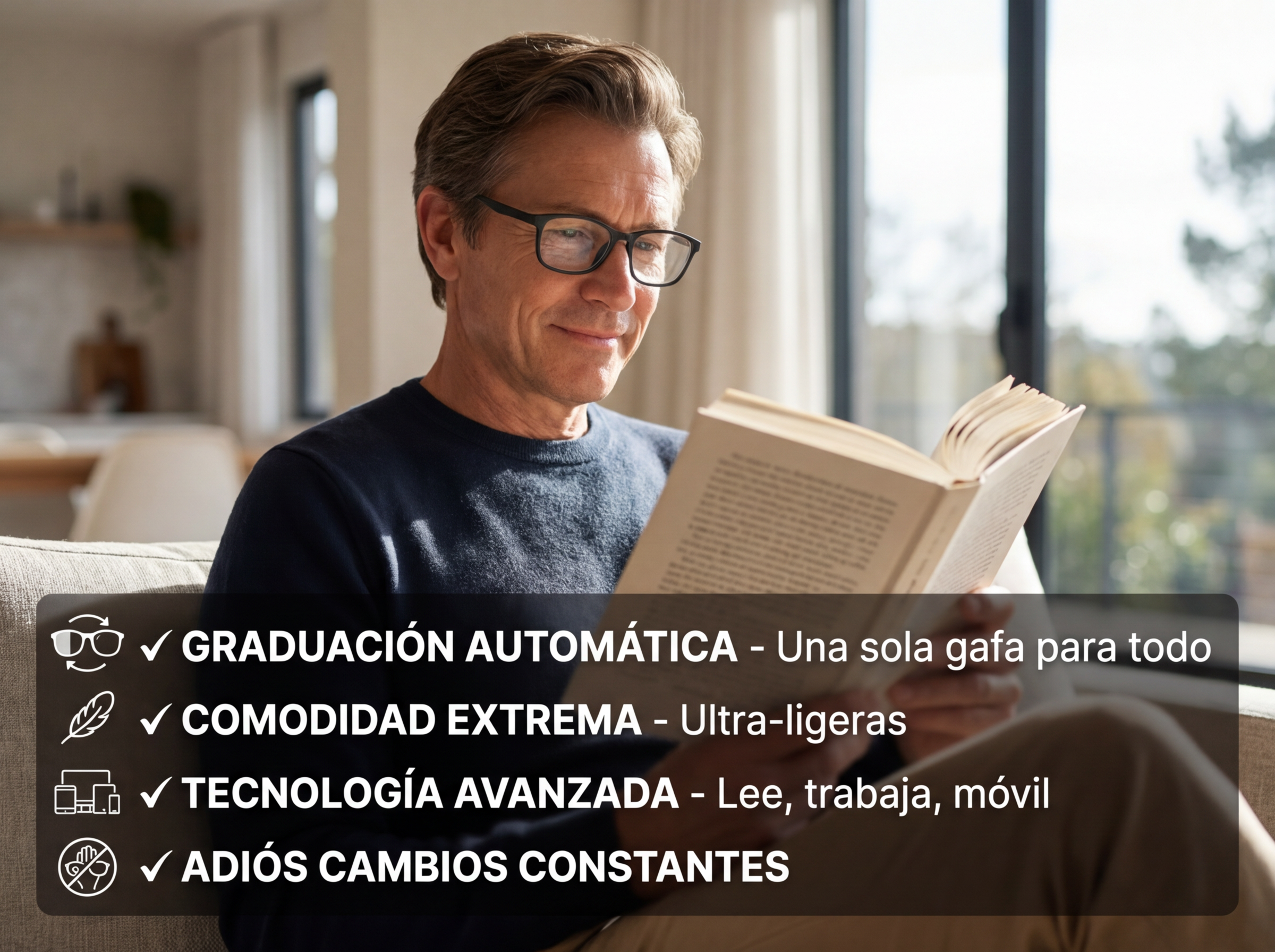 Tecnología de graduación variable automática: lee, trabaja en el ordenador y usa el móvil con las MISMAS gafas. ¡Adiós a los cambios constantes!